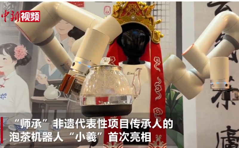 5月29日,在第九届中国成都国际非物质文化遗产节设立的科技赋能非遗专题展上,“师承”非遗代表性项目传承人的机器人茶艺“大师”小羲首次亮相,用一口地道“川味”为过往民众沏上热茶。